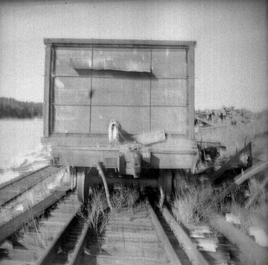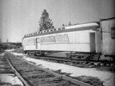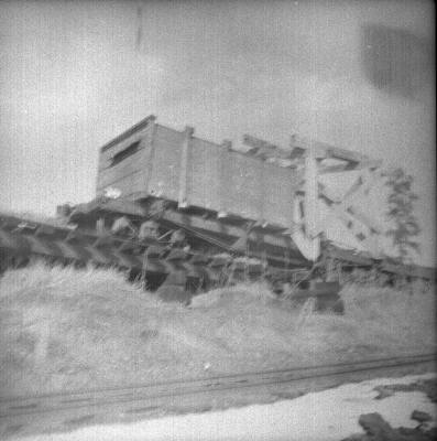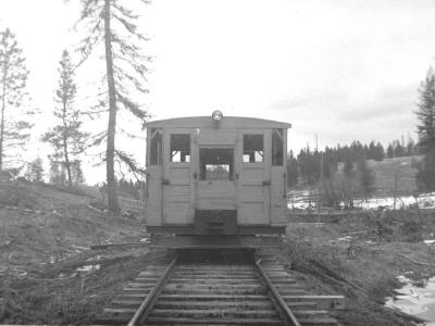 Gibson speeder near Forest, Idaho. December 22, 1946. Ivan Ergish photo. John remarked "Ivan Ergish did dimensions of this speeder and I drew up 1/4" scale planes of it some years ago. There are a lot more detail photos of this speeder in Ivan's photos.