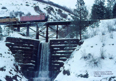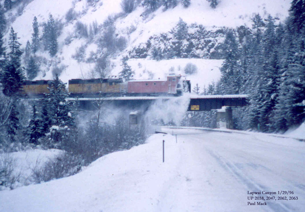Jan 29, 1996. CSP rotary #26 crossing highway 95 in Lapwai canyon. Paul Mack photo. | |