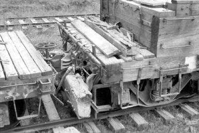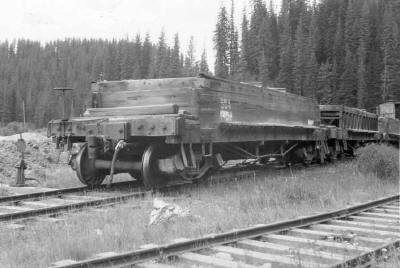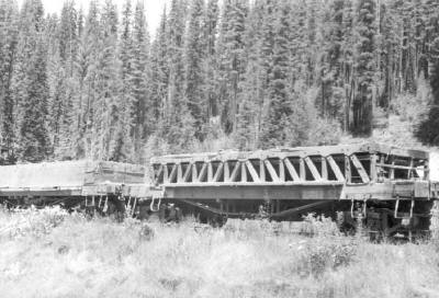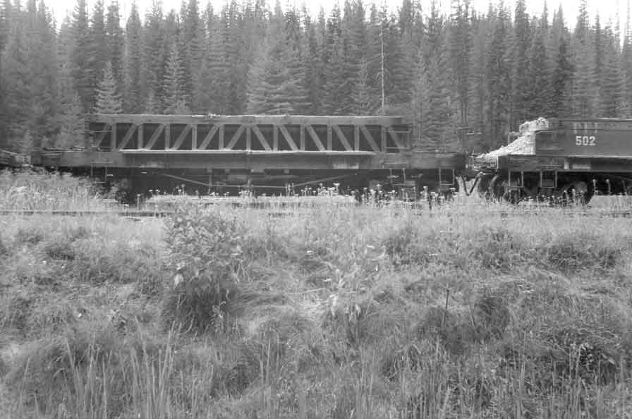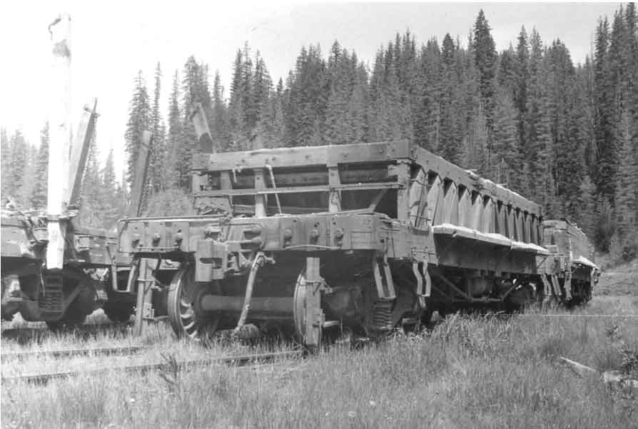 PFI 502. Headquarters, ID July 3, 1961. Ivan Ergish photo. This detail shows the "ballast spreader" timber permanently attached to one of the trucks.