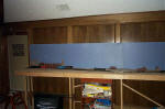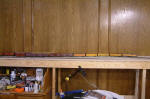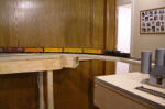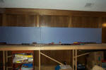 11/21/02: With the Ft. Worth train show open house over, I had a chance to clear the junk off my bench work and take some pictures. Here are some photos of my switching layout as of Nov. 18, 2002. Most of the track is just sitting on the homasote and very little has been wired. Before I get much farther, I need to add some clouds, trees and hills to the backdrop. I also need more light.